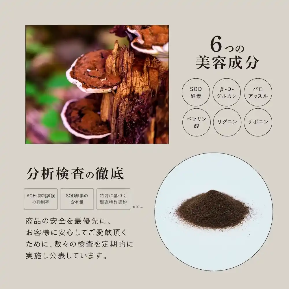 お味は、まろやかでほんのり甘く、コク深く癖のない飲みやすさ。旅先や出張、オフィスでも、サッと水やお湯に溶かすだけで、いつでも気軽に極上のチャーガ茶をお楽しみ頂けます。 |