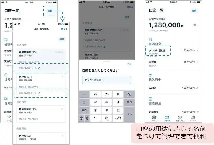 〈お客さまの声〉 口座番号だけでは分かりづらいから、生活費や貯蓄など目的別に口座に名前をつけたい…… 。 |