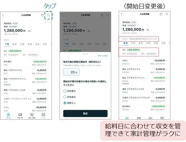 入出金明細の月間収支の計算開始日を給料日等に変更できるようになりました。開始日を25日に設定した場合、前月25日から今月24日までの収支が表示されます。 |