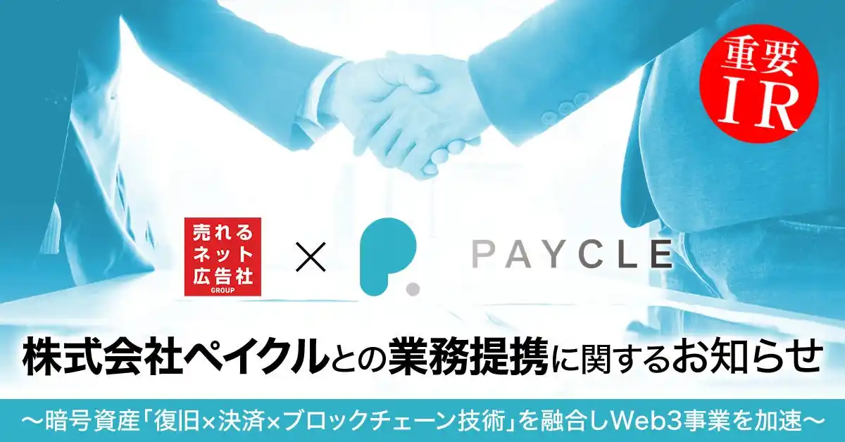 【売れるネット広告社グループ株式会社】 売れるネット広告社グループ(9235)株式会社ペイクルとの業務提携に関するお知らせ~暗号資産「復旧×決済×ブロックチェーン技術」を融合しWeb3事業を加速~