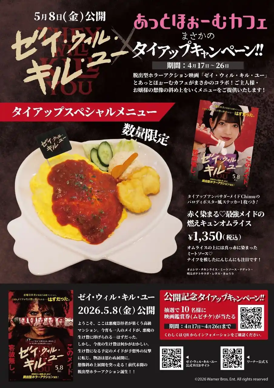インフィニア株式会社(本社:東京都千代田区、代表取締役:深沢孝樹)が運営するメイドカフェ「あっとほぉーむカフェ」は、2026年4月17日(金)から4月26日(日)までの期間、「あっとほぉーむカフェ 秋葉原ドンキ店」にて、脱出型ホラーアクション映画『ゼイ・ウィル・キル・ユー』とのタイアップキャンペーンを開催いたします。 |