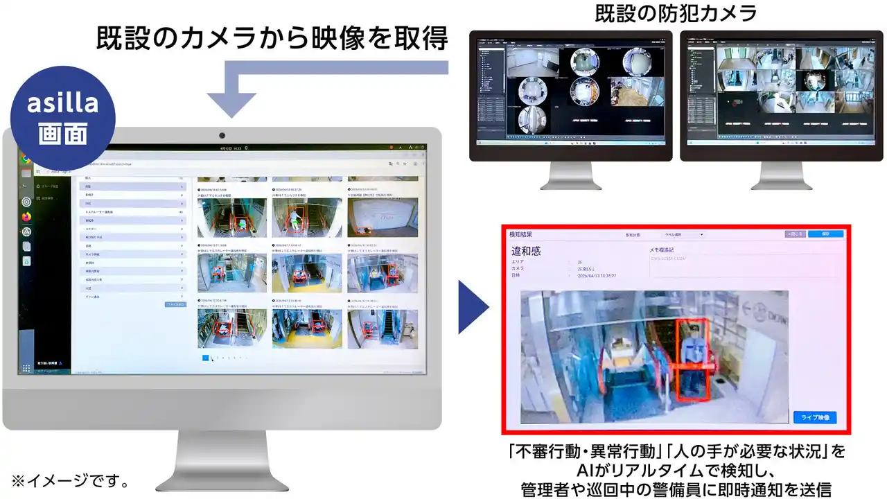 これまでも、警備員による巡回や防犯カメラによる監視を定期的に実施してきましたが、施設内の防災センターへの連絡に一定の時間を要する点が課題となっていました。そこで、施設内各所に設置された防犯カメラの映像を解析し、AIが異常を検知した場合には自動で通知されるソリューション「AI Security asilla」を導入しました。 |