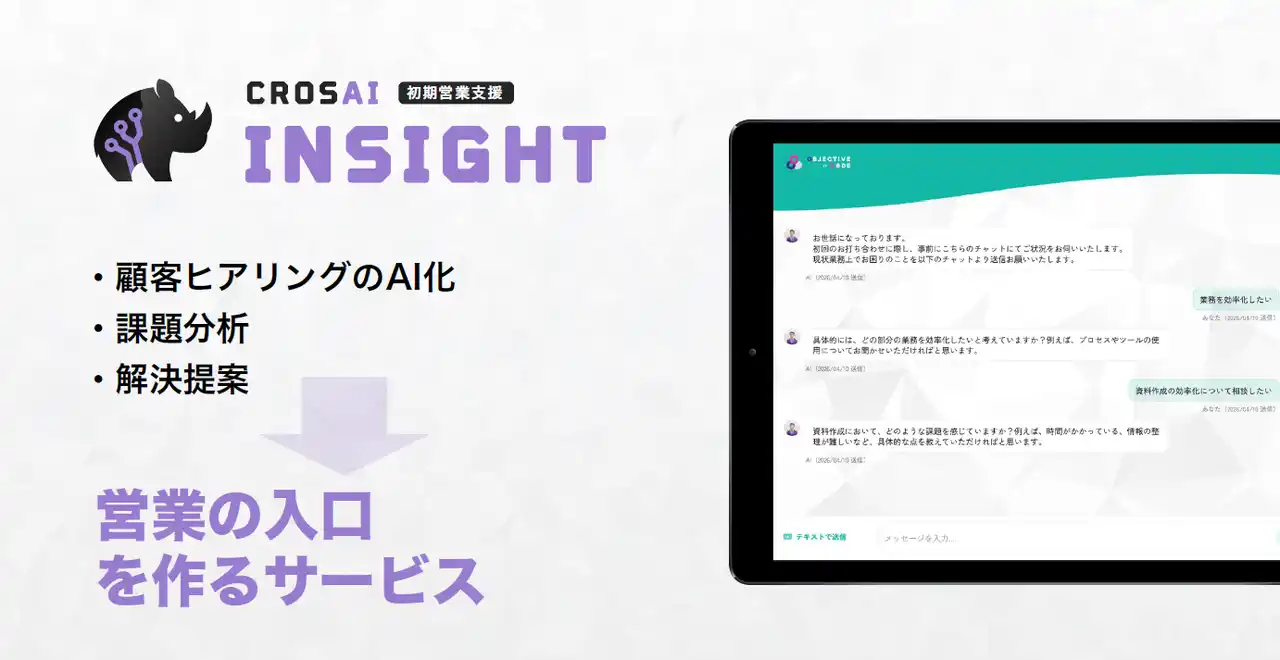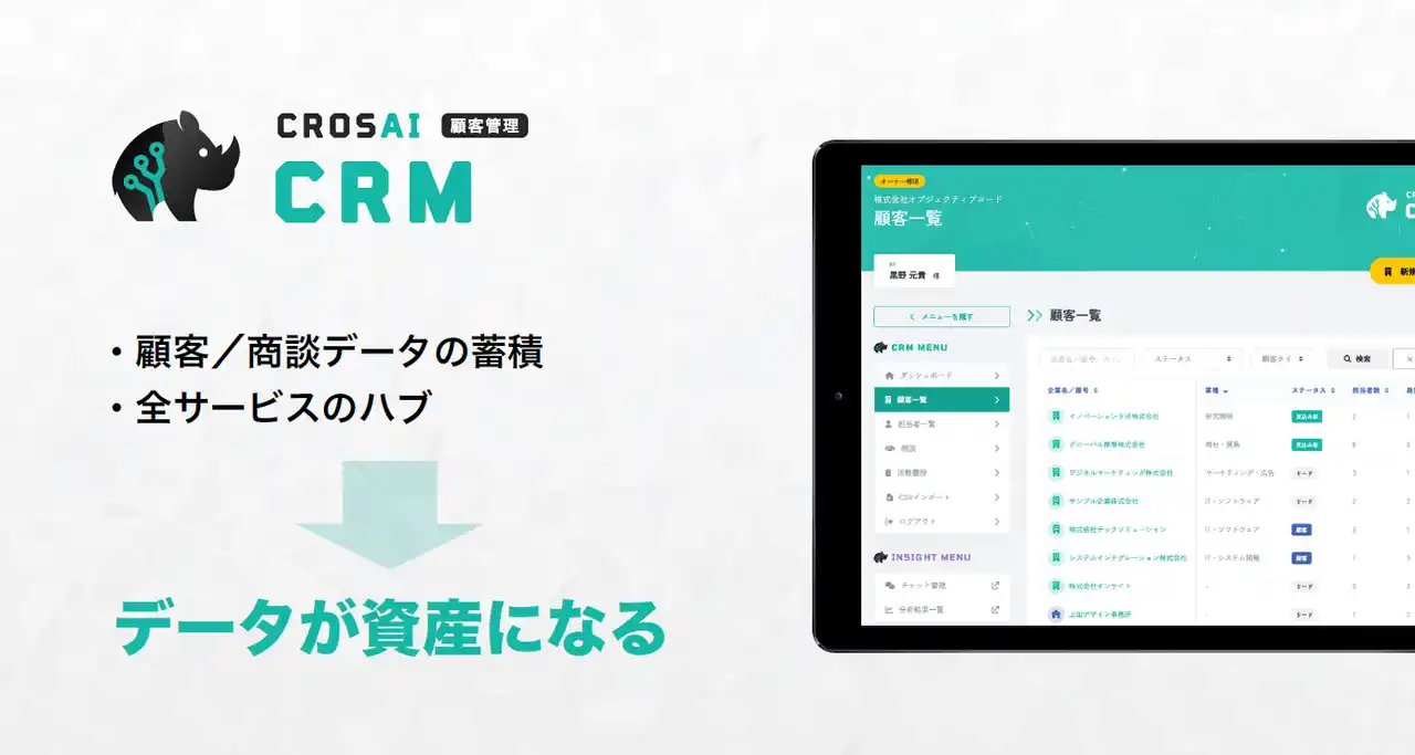 株式会社オブジェクティブコード(本社:東京都港区、代表取締役:溝口 勇樹)は、モジュール型AI・DXサービス「CROSAI(クロサイ)」のβ版第一弾として、顧客管理を担う「CRM(シーアールエム)」とAIが顧客課題を自動整理する「INSIGHT(インサイト)」の2つの機能を提供開始いたします。 |