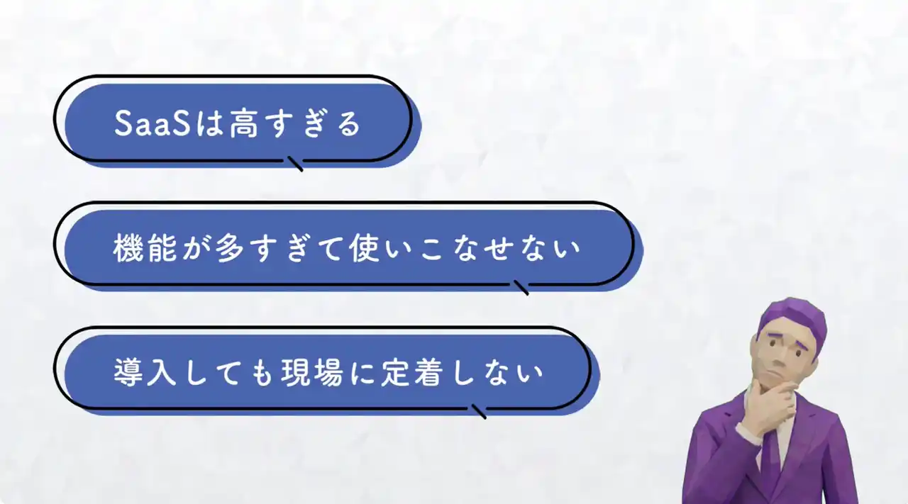 「高額な維持費」「機能過多」といった既存SaaSの課題を解決。最短3分で即日利用でき、まずは0円で現場への定着を推進します。企業の成長フェーズに合わせて必要な機能を拡張できる、無駄のないDXを実現します。 |