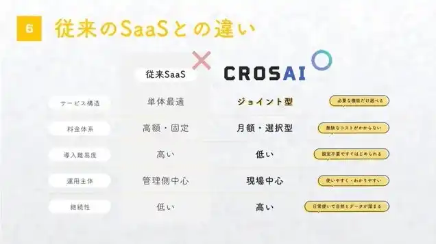 <従来システムとの明確な違い> ・従来型SaaS: 導入難易度が高い一括導入 / 使わない機能にもかかる高額な固定費 ・CROSAI: 現場が無理なく使える段階的導入 / 必要な機能だけを選ぶモジュール型 |