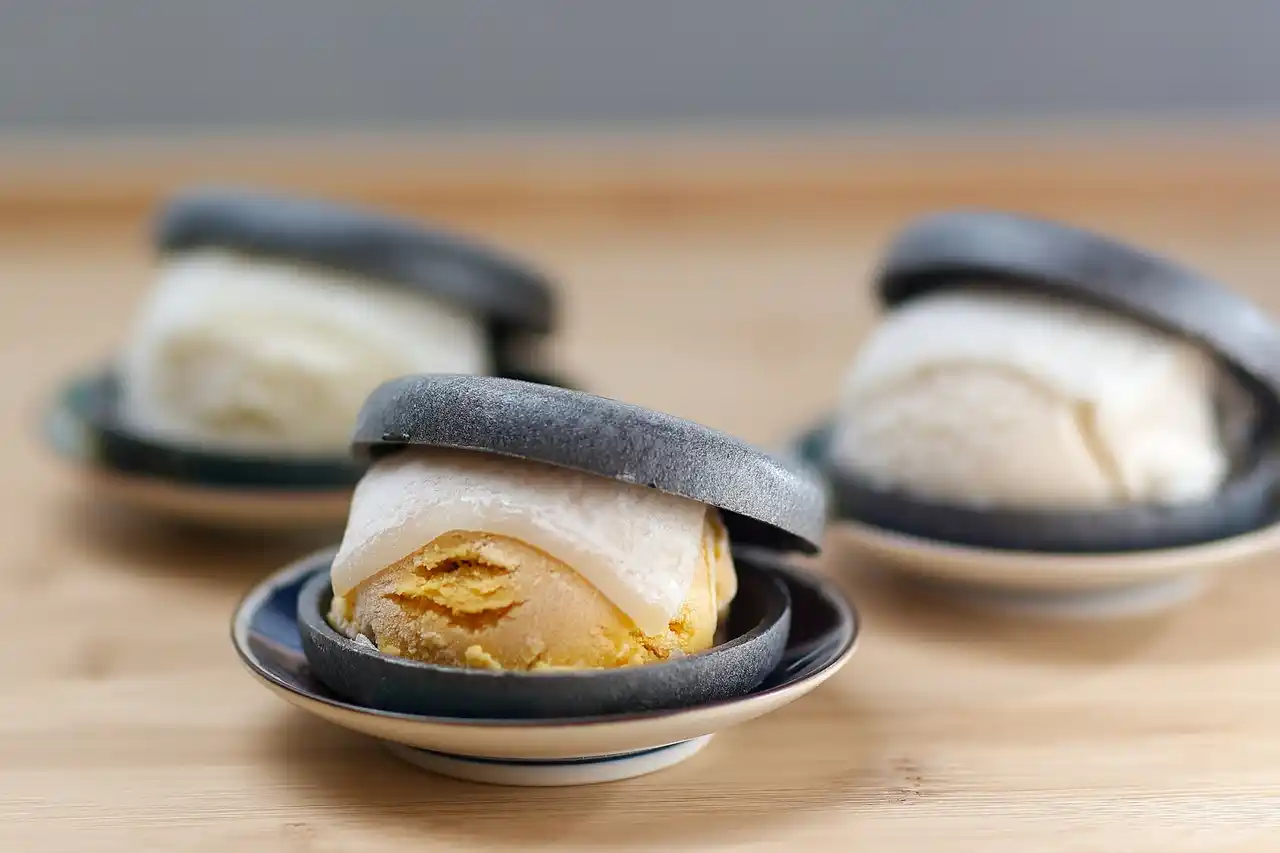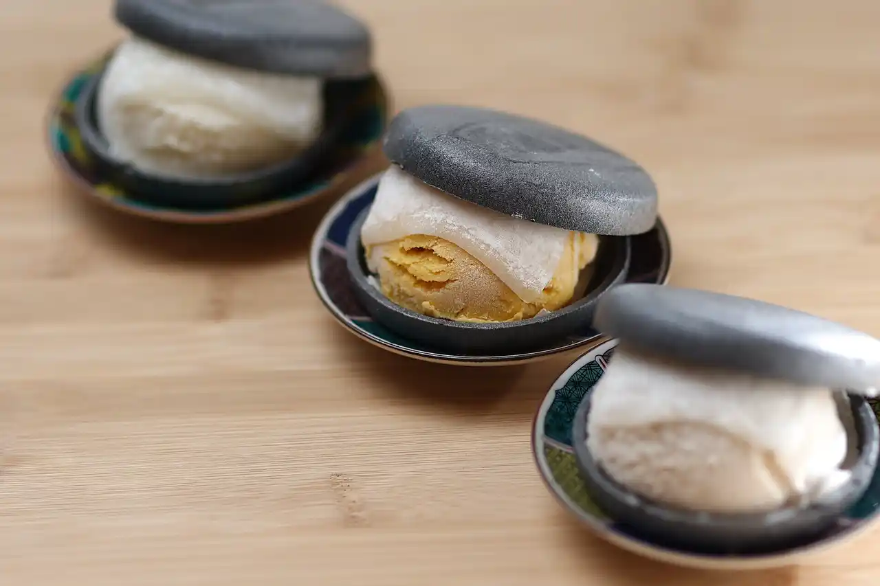 | 漆黒の最中に包まれたのは、もちもちの大福と濃厚なジェラート。まさに、和と洋の贅沢なマリアージュです。 | |||