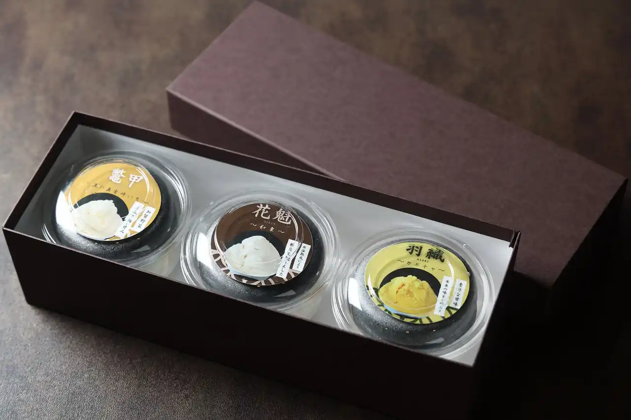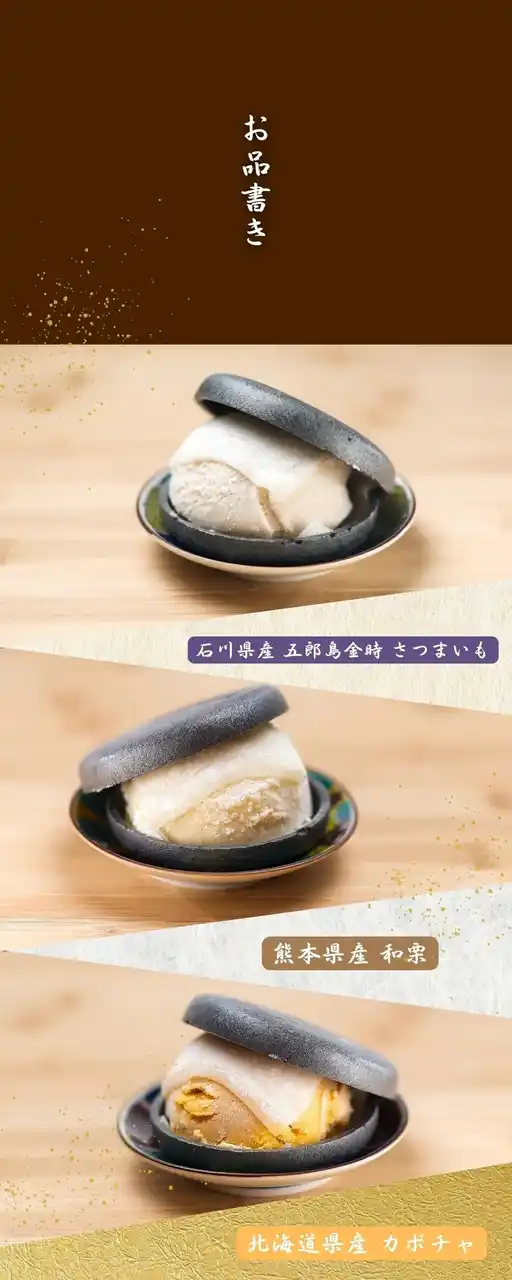 | 選べるフレーバー:いも、栗、カボチャなど、当店人気の和素材を使用。九谷焼の名にちなみ「花魁」「龍甲」「羽織」といった名を冠した特別仕様。 | |||