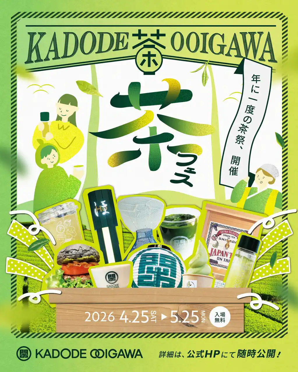 緑茶・農業・観光の体験型フードパーク「KADODE OOIGAWA(かどでおおいがわ)」(静岡県島田市・代表取締役 福本作治)では、毎年恒例となるお茶の祭典「茶フェス」を開催いたします。新茶の販売をはじめ、お茶を使用した限定グルメやスイーツ、さらにはお茶の魅力を体験できる多彩なイベントをご用意し、子どもから大人まで楽しめる“お茶づくし”のひとときをお届けします。 |
