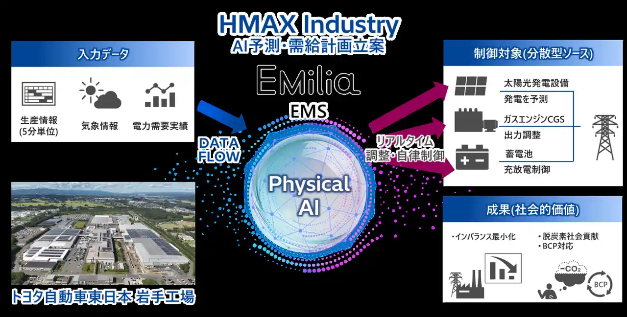 株式会社日立製作所(以下、日立)は、このたび、トヨタ自動車東日本株式会社(以下、トヨタ自動車東日本)の岩手工場(岩手県胆沢郡金ケ崎町)へ、「HMAX Industry」のEMS(Energy Management System)である「EMilia(エミリア)」を納入し、2026年4月より稼働を開始しました。本取り組みでは、トヨタ自動車東日本と共同で、自動車工場向けに「フィジカルAI*1」技術を実装した「EMilia」の機能を拡張しています。これにより、高精度な電力需要予測とリアルタイムな需給コントロールを実現し、トヨタ自動車東日本が供給を受ける、水力や風力、太陽光などのオフサイト・オンサイト再エネ電力を活用するために電力需給バランスを最適化し、事業の安定運営と脱炭素社会に貢献します。 |
