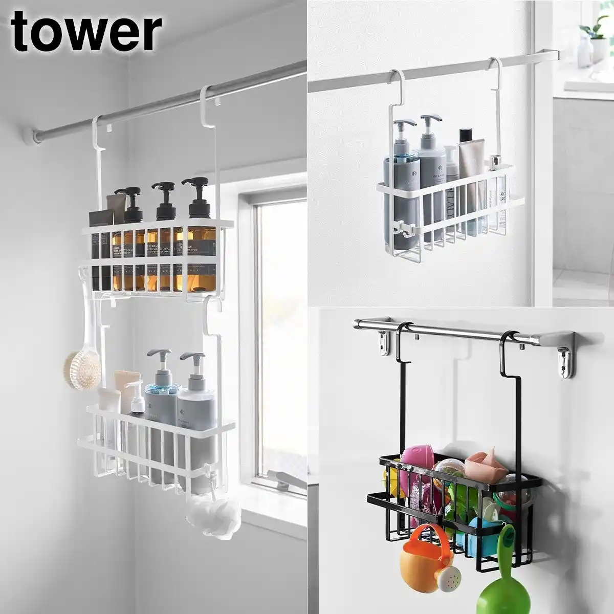 ■バス用品や掃除用品を浮かせて収納できる連結可能なバスケット ランドリーパイプやタオルバー、浴室扉のハンドルに引っ掛けて、バス用品を浮かせて収納できるバスケット。 |