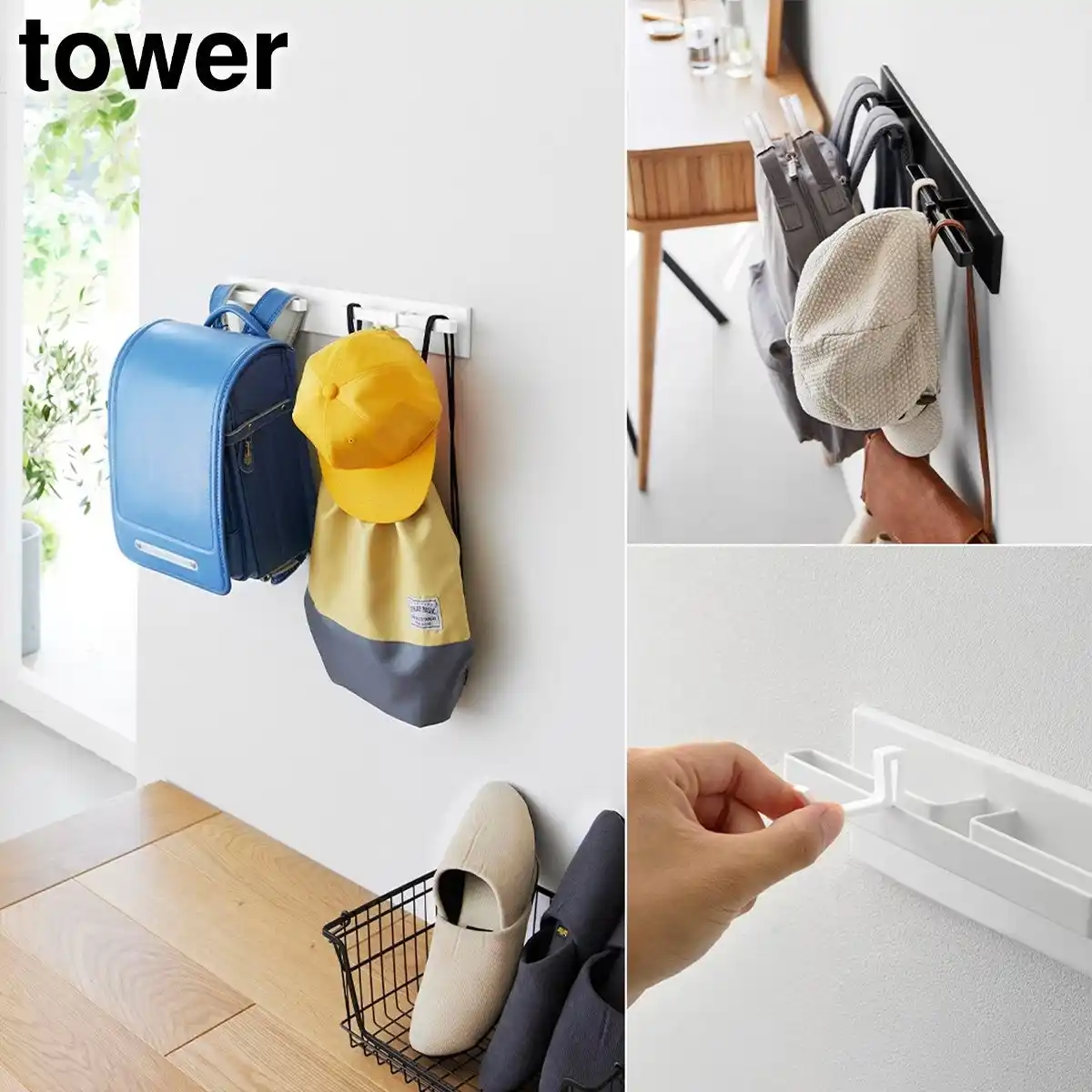 | ハンドバッグや帽子、ランドセルの持ち手部分を引っ掛けて、通学グッズをまとめて収納するのもおすすめです。 | |||