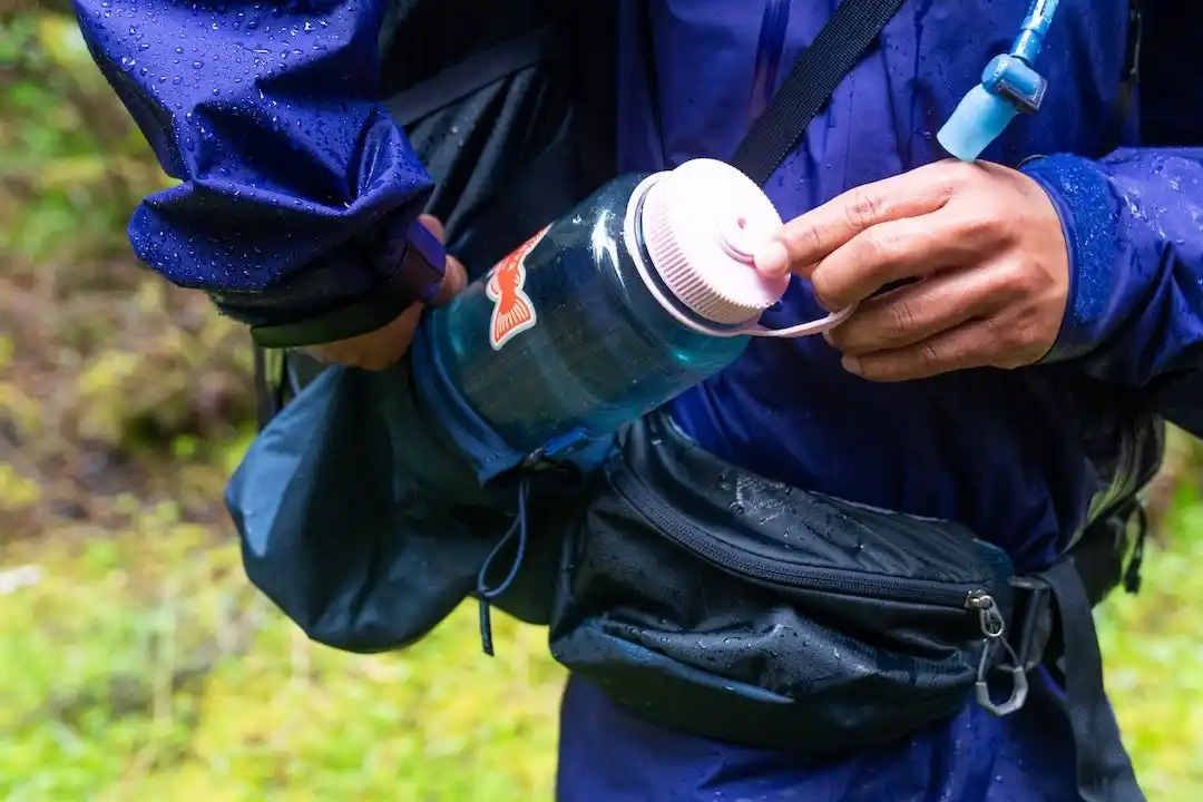 ボトルホルスターは、ウォーターボトルを片手で簡単に出し入れ可能でバンジーコードでしっかりと閉じる構造 |