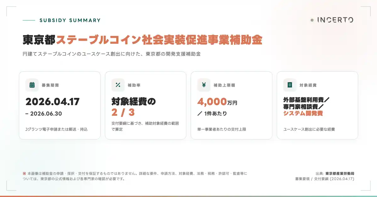 2023年6月施行の改正資金決済法により、円建てステーブルコインは「電子決済手段」として正式に位置づけられ、発行・仲介の枠組みが整備されました。発行体面では、JPYC株式会社をはじめとする国内事業者が日本円建てステーブルコインの発行・提供を具体化しています。政策面では、東京都が2026年4月17日に補助金(補助率3分の2、1件あたり上限4,000万円)の公募を開始し、ユースケース創出を後押しする姿勢を示しました。 |