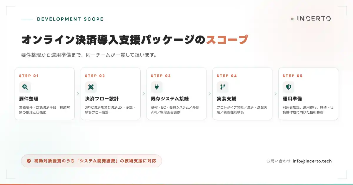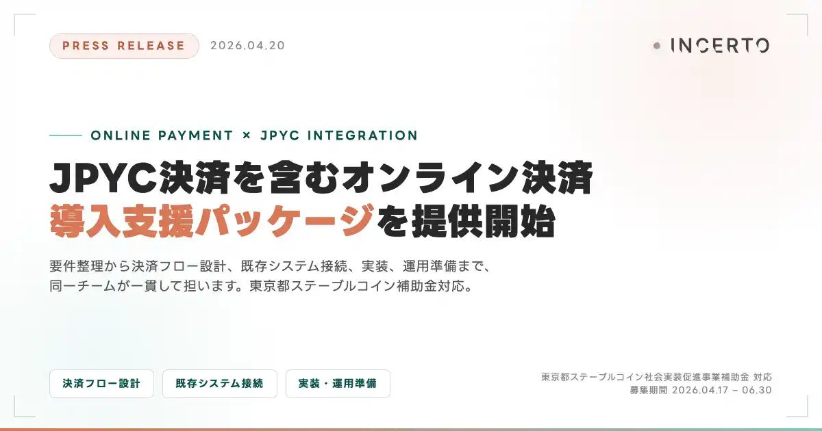 Incerto合同会社(本社:東京都荒川区、代表:佐藤碧人、https://www.incerto.tech/)は、日本円建てステーブルコインを含むオンライン決済の導入支援を行う「オンライン決済導入支援パッケージ」の提供を開始しました。要件整理から決済フロー設計、既存システムとの接続方針の策定、実装支援、運用準備まで、同一チームが一貫して担います。 東京都は2026年4月17日、ステーブルコイン社会実装促進事業補助金(補助率3分の2、1件あたり上限4,000万円、募集期間2026年6月30日まで)の公募を開始しました。制度・発行体・政策の条件が揃いつつある今、事業に合った決済体験をどう組み込むかが、企業の実務課題になっています。Incertoはこの局面に向けたパッケージを提供し、初回は無料ヒアリングを実施します。 |