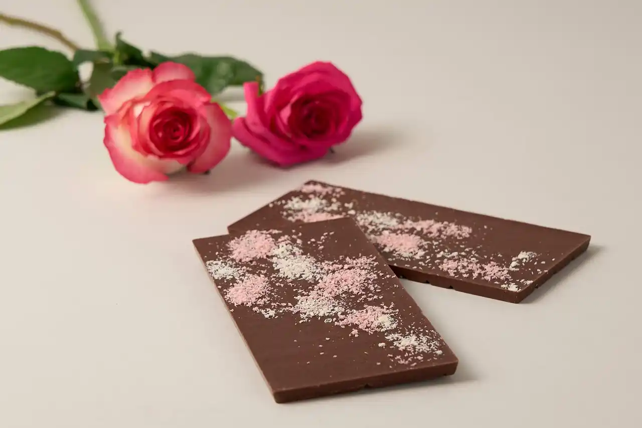 土台となるのは、赤いベリーのような爽やかな酸味が特徴のマダガスカル産カカオ。ローズオイルの優雅な香りを引き立てるため「細挽き」製法を採用しました。酸味の角を落とし、砂糖の種類まで吟味することで、カカオの果実感とバラの香りが完璧なハーモニーを奏でる仕立てにこだわりました。 |