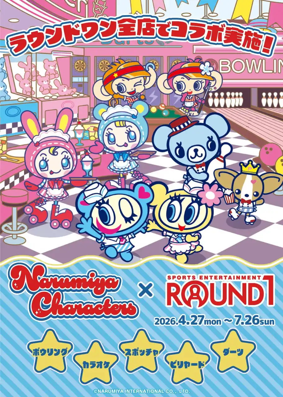 株式会社ラウンドワンジャパン(本社:大阪府大阪市、代表取締役社長:川口 英嗣)は、この度、2026年4月27日(月)~7月26日(日)の期間、株式会社ナルミヤ・インターナショナル(東京都港区、代表取締役社長執行役員:保坂大輔)が展開するブランドキャラクター「ナルミヤキャラクターズ」とのコラボキャンペーンを実施いたします。 |