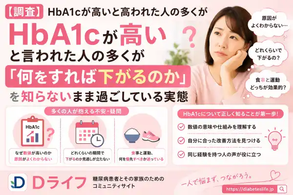 「HbA1c 高い 原因」「HbA1c 下げるには 食事」「どれくらいで下がる」といった検索キーワードへの関心が近年高まっています。健康診断の結果を受け取り、数値の意味や改善の見通しを知りたいと感じた方が、まずインターネットで情報収集を始めるケースが多いようです。弊社が運営するコミュニティでも、「先生には数値が高いと言われたが、具体的な説明がなくて困っている」「何から手をつければいいかわからない」といった声が継続的に寄せられており、HbA1cにまつわる情報ニーズの高さが確認できます。受診のきっかけとしては健診結果が多い一方で、その後の行動につながる情報が十分に届いていないという実態が見えてきたことから、今回の調査をまとめることにしました。