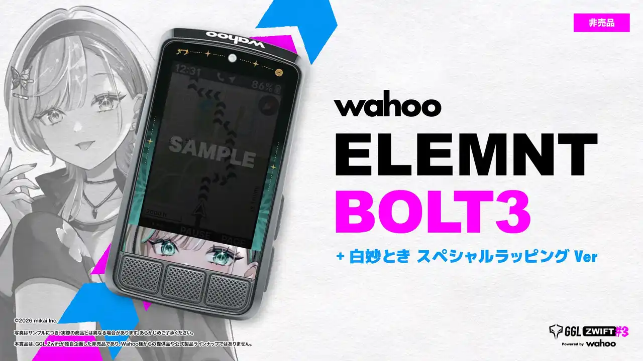 | 累計参加者数28,000人を超える国内最大級のeスポーツコミュニティ「GGL」は、バーチャルサイクリングアプリ「Zwift」を用いたeスポーツ大会「第3回GGL Zwift Powered by Wahoo」の特別企画として、人気VTuber「白妙とき(VRAID所属)」のオリジナルデザインを施した特別ラッピング仕様のサイクルコンピューターが抽選で当たるプレゼントキャンペーンを開始いたしました。 | |||||||||
