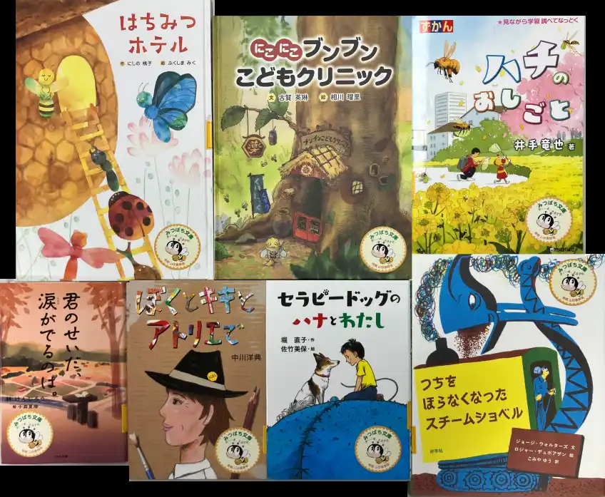 今回は1校当たり、7冊の書籍をセットにして寄贈しました。寄贈図書のうち、2冊は当社主催の「ミツバチの絵本コンクール」の最優秀賞作品を書籍化した絵本を贈り、他の5冊については、みつばち文庫のテーマに則った書籍を選定し、ランダムに寄贈しています。 |