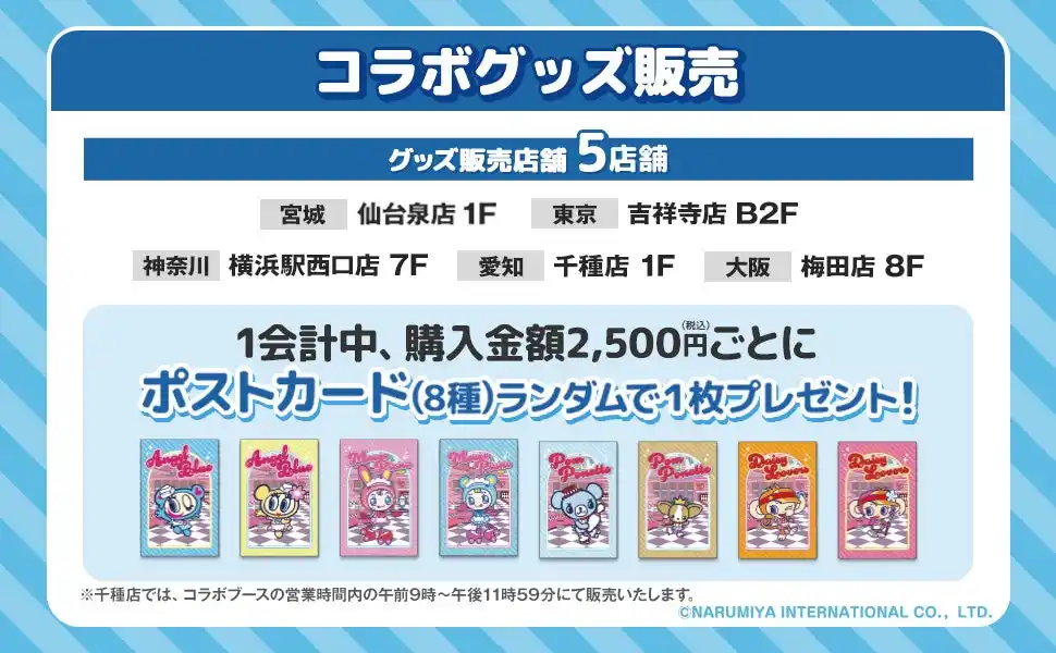 吉祥寺店・横浜駅西口店・梅田店・千種店・仙台泉店の5店舗にて、コラボグッズ販売を実施いたします。 |