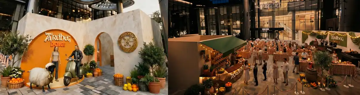 会場では、「La Dolce Islay」の世界観のもと、甘さとスモーキーさが共存するアードベッグの個性を五感でご体感いただけます。南イタリアの広場を思わせる祝祭空間の中心には、柔らかな灯りに包まれた「ザ・ドルチェ バー」が登場。アードベッグのスモーキーな香りとともに、特別なひとときをお楽しみいただけます。さらに、甘さとスモーキーさが重なり合うペアリング体験や、シチリアのストリートミュージックとスコットランドのケルト音楽が融合した、この日のための特別な演奏が空間に溶け込み、世界観を一層高めます。 |