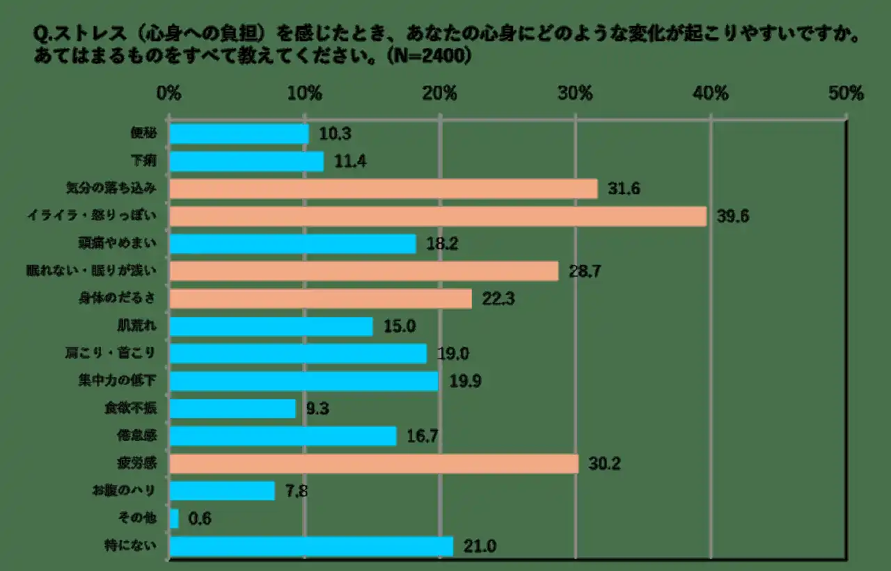 ストレスを感じた際の心身への影響としては、「イライラ・怒りっぽくなる(39.6%)」が最も多く、続いて「気分の落ち込み(31.6%)」「疲労感(30.2%)」「睡眠障害(28.7%)」「身体のだるさ(22.3%)」が上位に挙がりました。 |