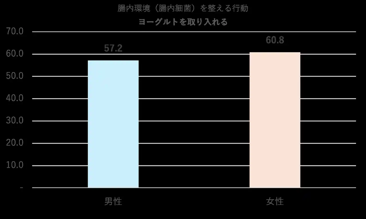 また、「腸活としてヨーグルトを取り入れている」人の年代を区切ってみると、20~40代間では年代が高くなるほど割合が増え、男女の比較では女性の方が取り入れている割合が多いことが分かりました。 |
