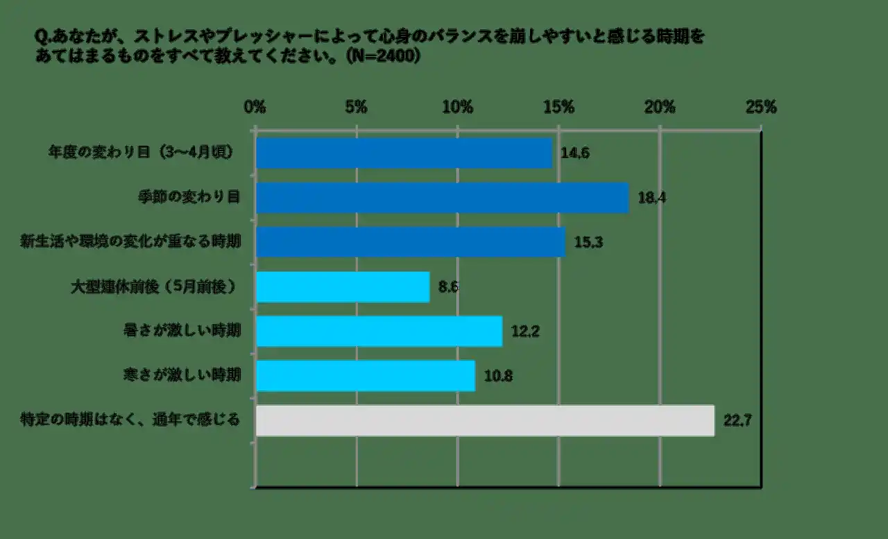 ・ストレスやプレッシャーにより心身のバランスを崩しやすい時期は、「1位:季節の変わり目(18.4%)」「2位:新生活や環境の変化が重なる時期(15.3%)」「3位:年度の変わり目(14.6%) 」と新生活や季節の変わり目などの“変化“があるタイミングが上位を占めた。 |