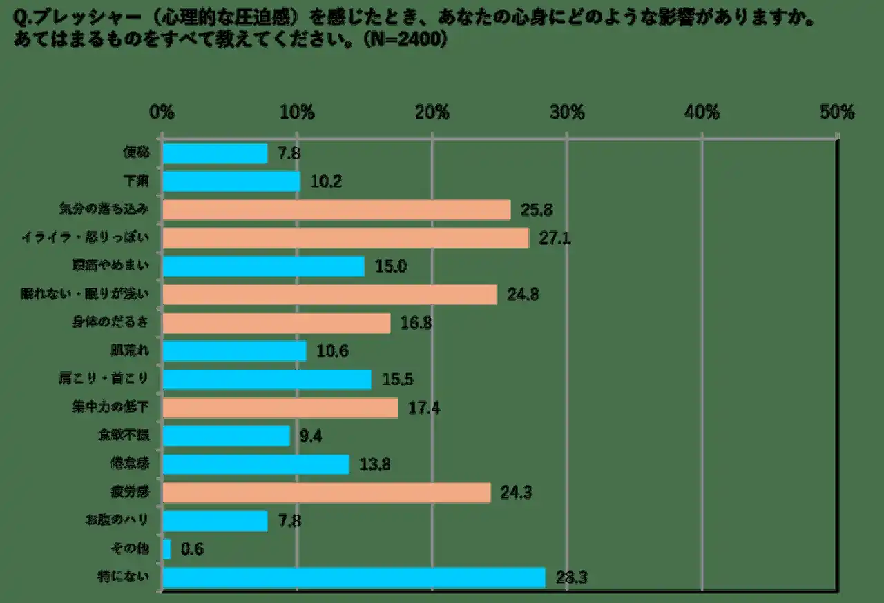 一方、プレッシャーを感じた際の心身への影響でも、「気分の落ち込み(25.8%)」「睡眠障害(24.8%)」「疲労感(24.3%)」「集中力の低下(17.4%)」が続きました。 |