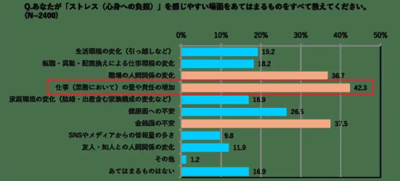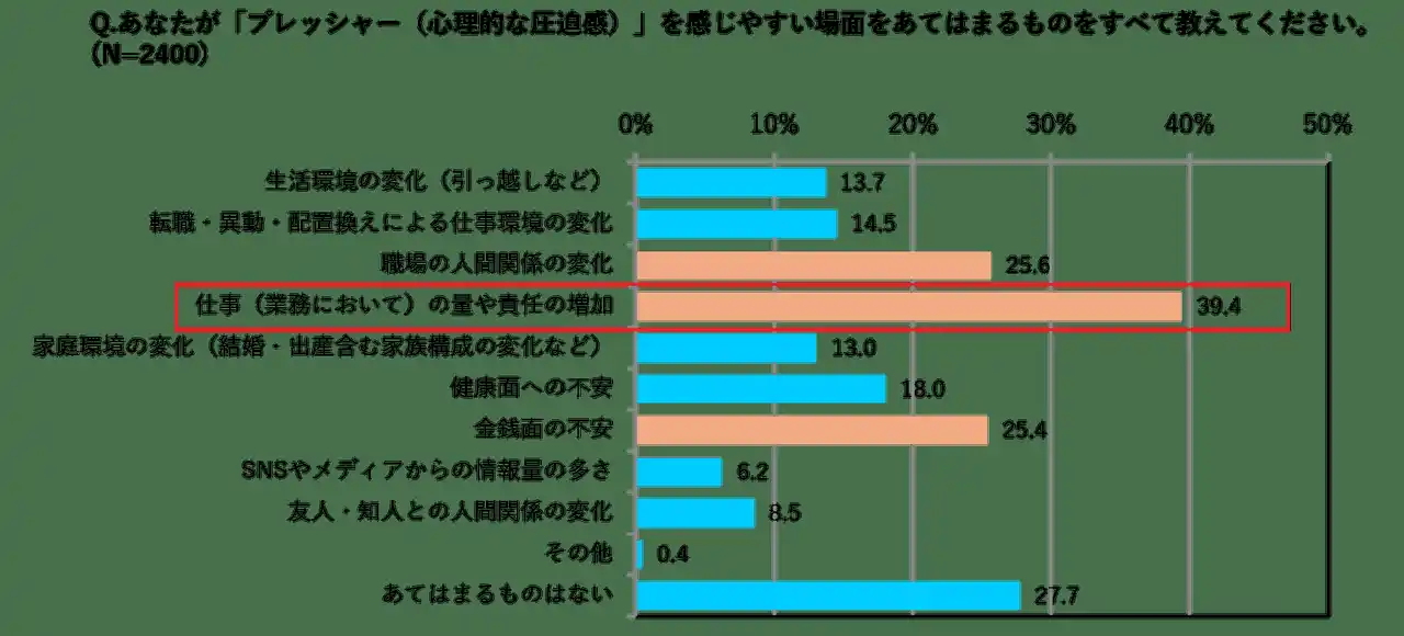 ・ストレスを感じる場面としては「仕事(業務)の量や責任の増加(42.3%)」が最も多く、同様にプレッシャーも「仕事(業務)の量や責任の増加(39.4%)」がトップに。 |