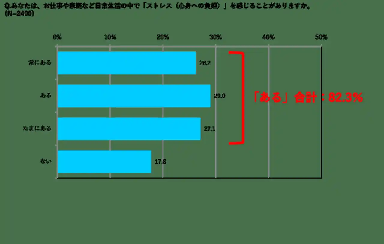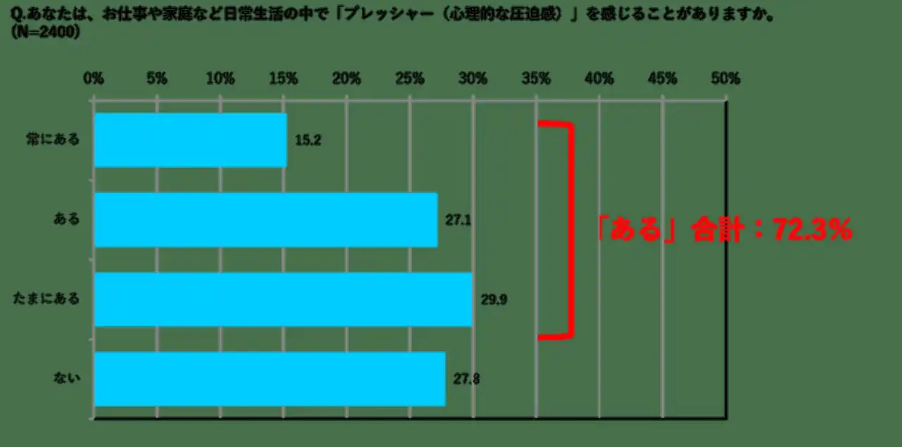 ・日常生活でストレスを感じている人は82.3%、プレッシャーを感じている人は72.3%。 |