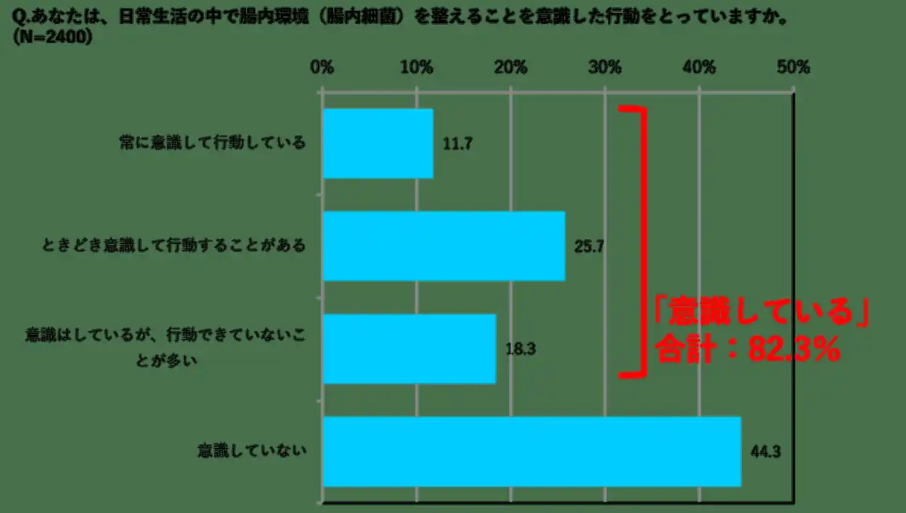 日常生活で腸内環境を整えることを意識している人は過半数(55.7%)に達しました。なかでもストレス・プレッシャーを感じている層では62.9%が腸内環境ケアを意識しており、感じていない層(14.1%)を大きく上回る結果になりました。心理的負荷を抱える人ほど、日常的なセルフケアとして腸活を取り入れようとする傾向がうかがえます。 |