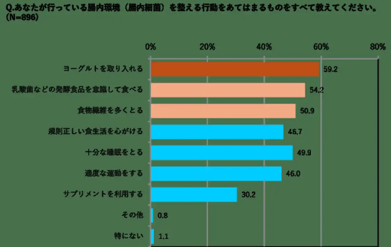 ・腸活を実践している人の対策は「1位:ヨーグルト(59.2%)」、「2位:乳酸菌などの発酵食品(54.2%)」、「3位:食物繊維(50.9%)」