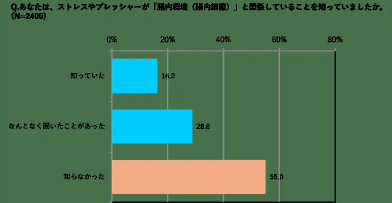 ・「ストレス・プレッシャーと腸内環境の関係(腸内環境と脳がリンク=腸脳相関)」は55.0%が知らない。 |