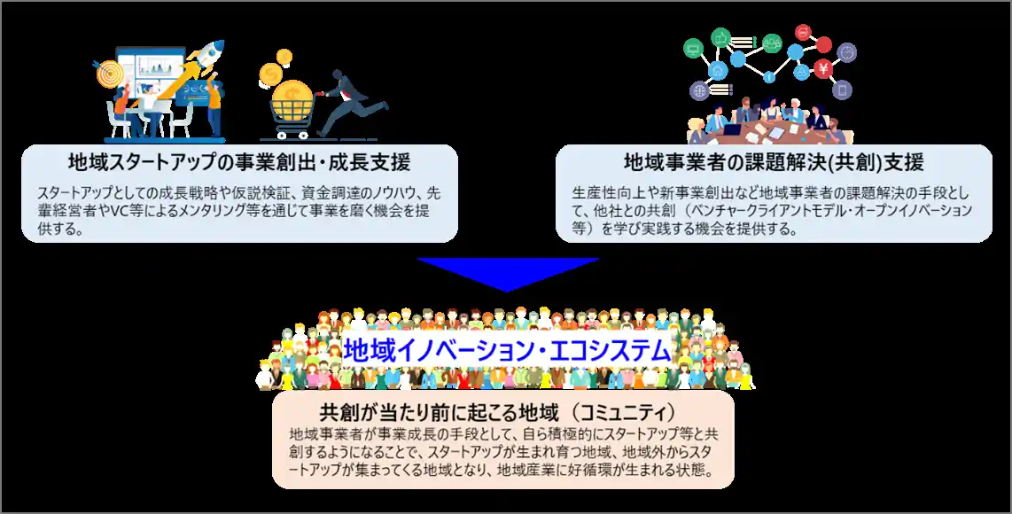 スタートアップと地域事業者等の共創による地域発のイノベーション創出に資する実績やノウハウを持つ事業者の皆様からのご応募をお待ちしております。 |