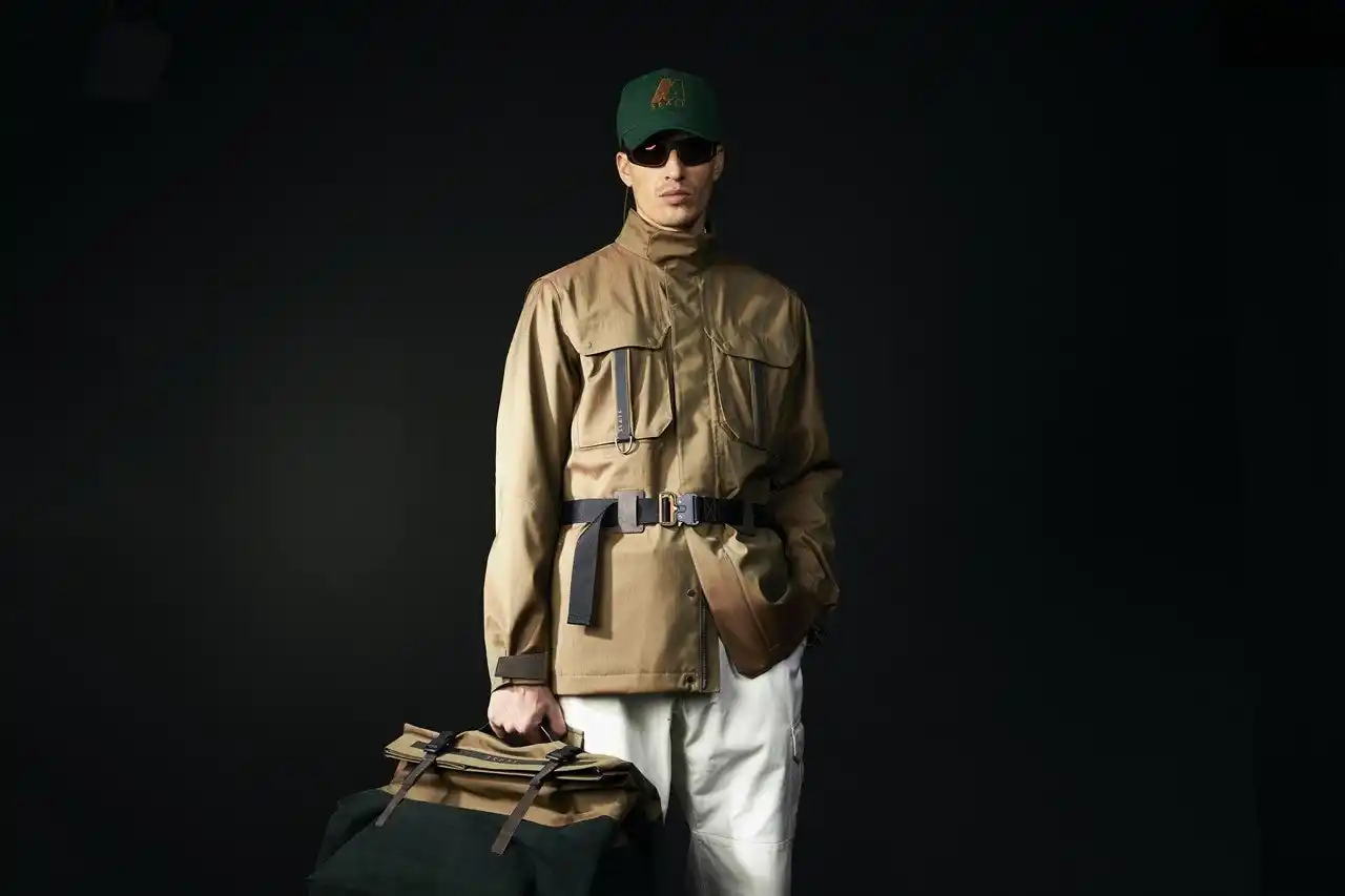 コレクションの中核を担う「Endurance Field Jacket」は、ソラーロ調ウールにラミネート加工を施した高機能アウター。ウエストベルトには、レーシングシートの安全機構から着想を得たディテールを採用し、デザイン性と機能性を両立しています。 |