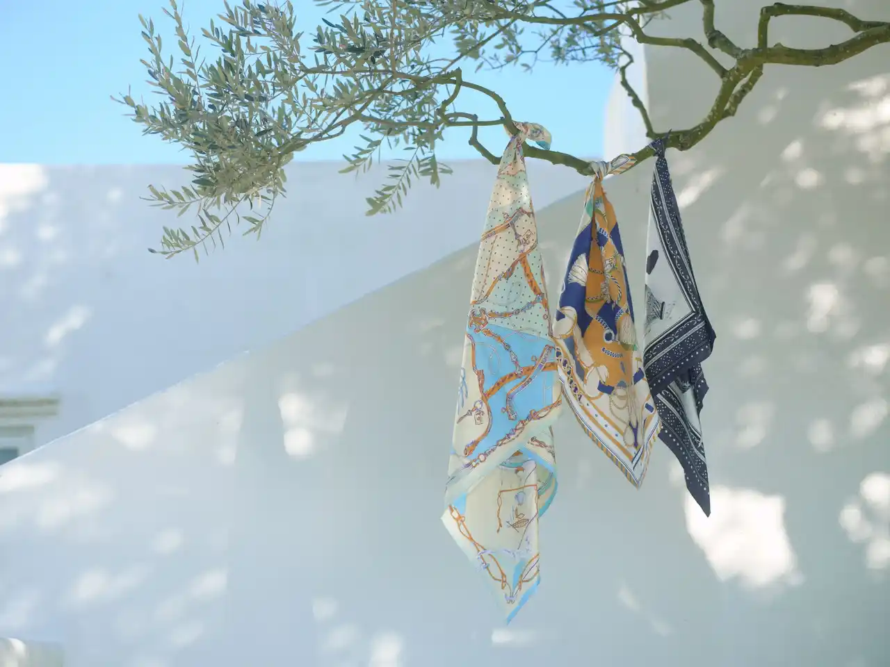 左から〈シルクスカーフ88〉ビットバルーン ¥22,000 〈シルクスカーフ65〉ピルエット ¥16,500 〈シルクスカーフ65〉バルーンバンダナ ¥16,500 全てシルク100% (全て税込) |