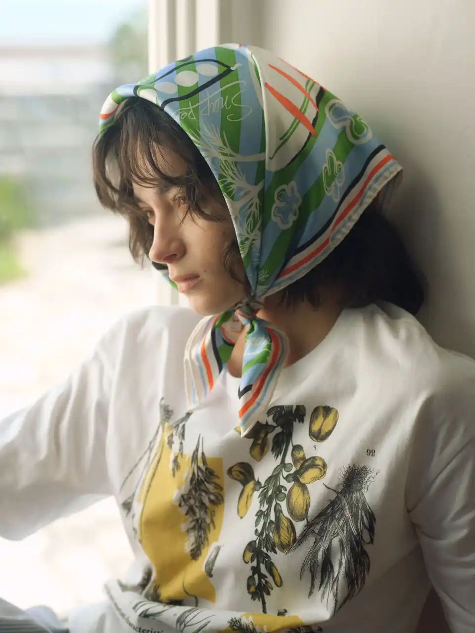 〈シルクスカーフ65〉ベジ シルク100% ¥16,500〈半袖S Tシャツ〉ボタニカル コットン100% ¥9,900 (全て税込) |