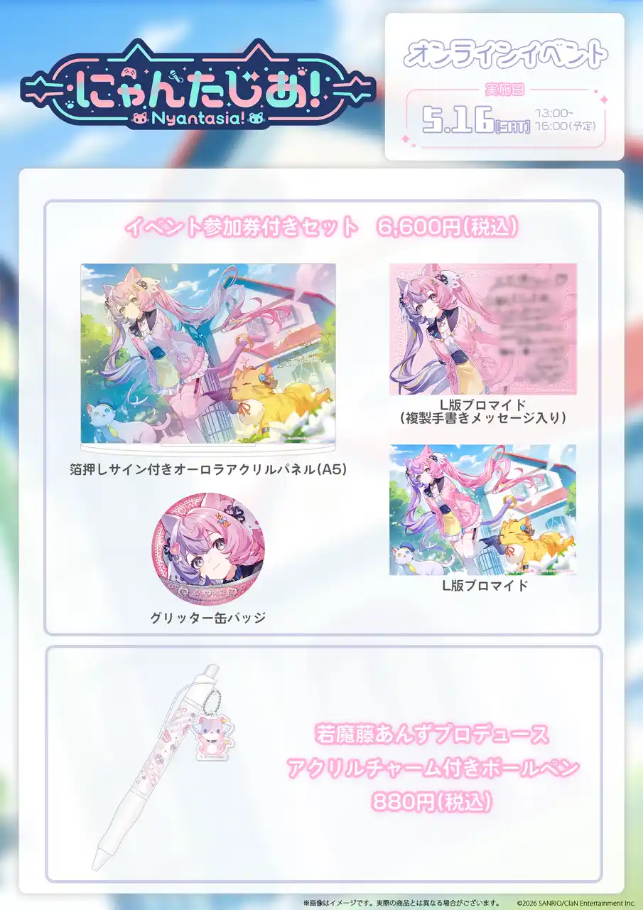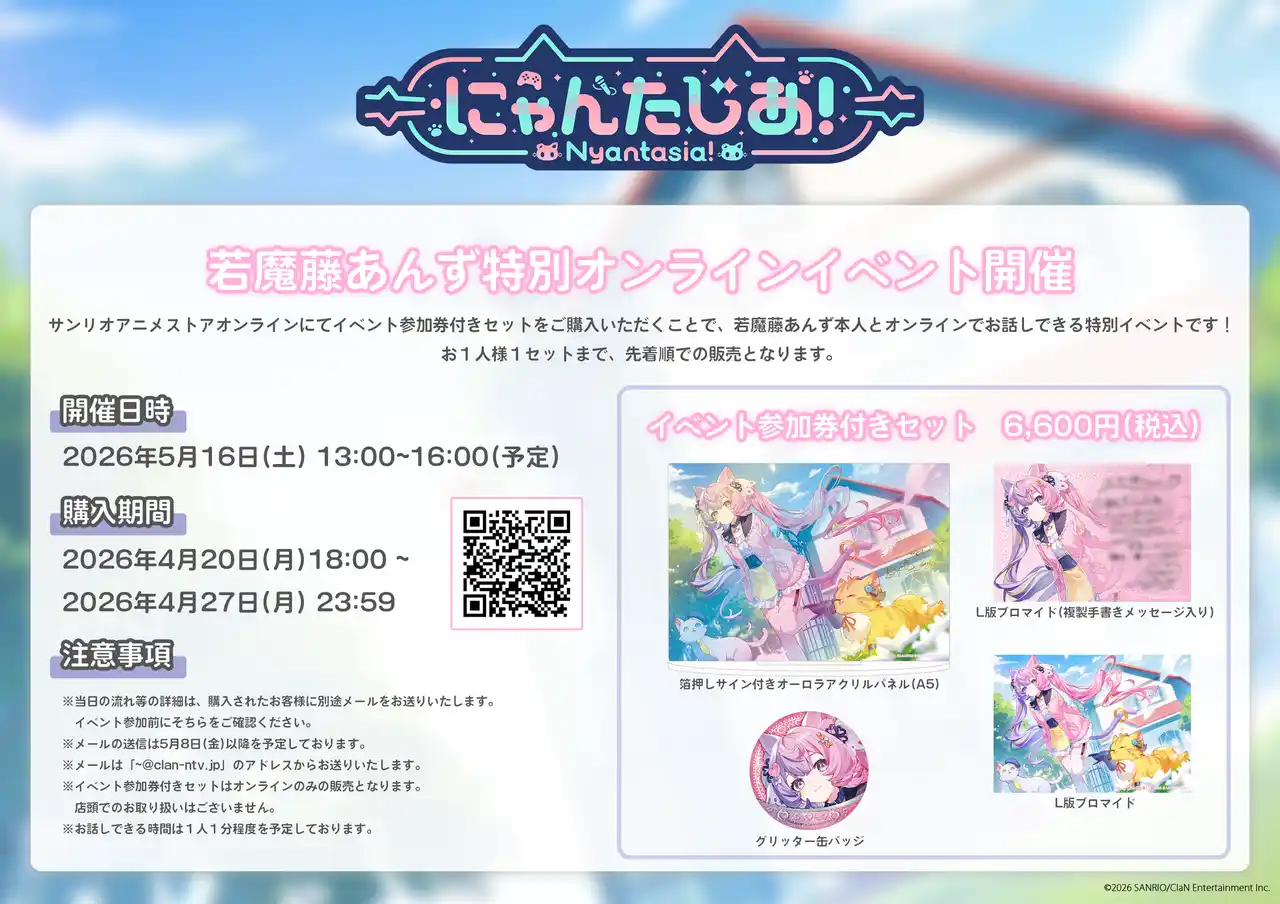 2026年4月20日18:00~2026年4月27日23:59までの先行受注期間中に通販サイト「サンリオアニメストアONLINE」でイベント参加券付き生誕グッズセットをご購入いただいた方には、2026年5月16日(土)13:00~15:00にオンラインで開催予定の特別イベントへご参加いただけます。