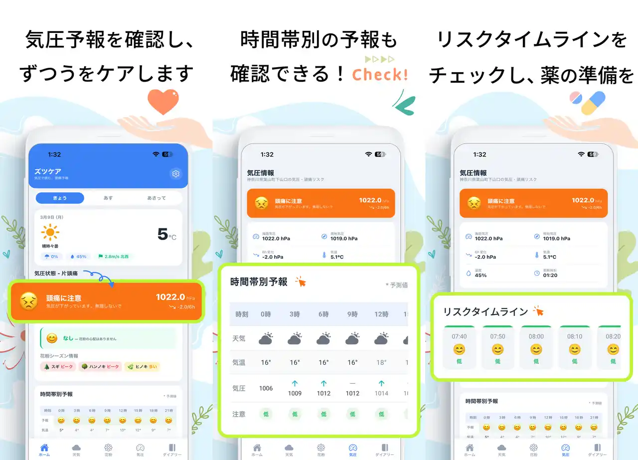 「ずつけあ」は、気圧変化グラフ・3日間天気予報・花粉飛散情報(10種類対応)・頭痛ダイアリーをワンストップで提供する気象病対策アプリです。日本で約1,000万人いるとされる天気痛に悩む方々を対象に、気圧変動を“見える化”し、事前対策を後押しします。 |