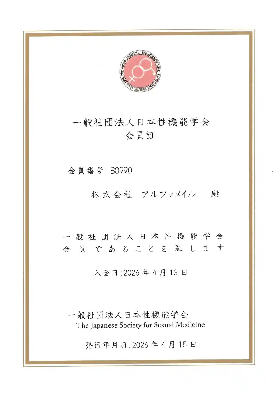 | 日本性機能学会に所属している企業として最新の知見を取り入れることは、株式会社アルファメイルが目指す「日本人男性のQoL向上」という目的達成の一助になると確信しております。 | |||
