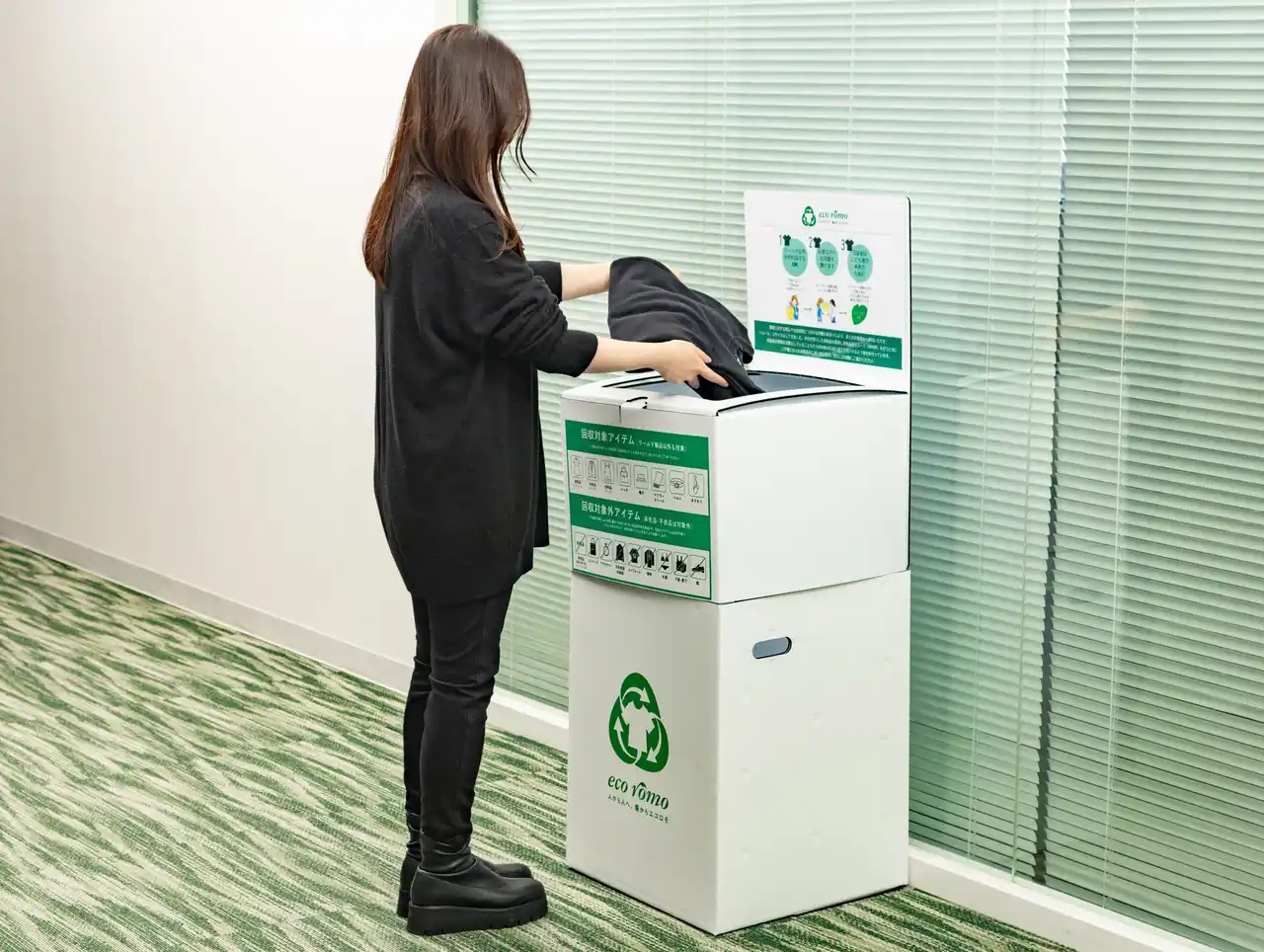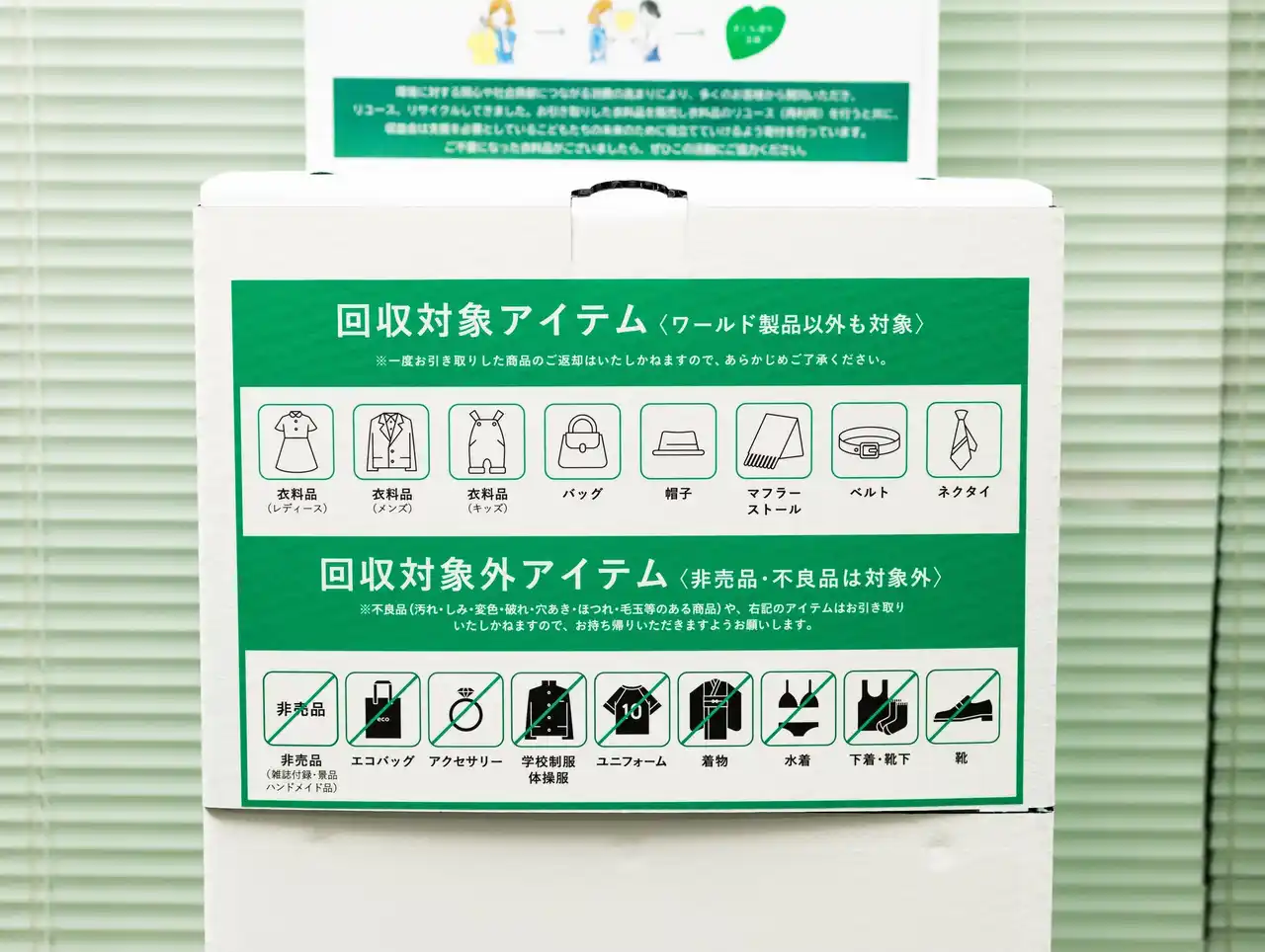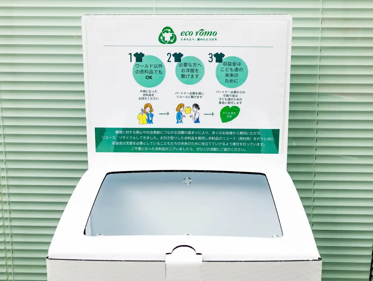 | 当社では、「ワールド エコロモ キャンペーン」への参画にあわせ、広島本社内に「エコロモ衣料回収BOX」を設置し、社員を対象とした衣料回収を実施しています。 | |||||||||