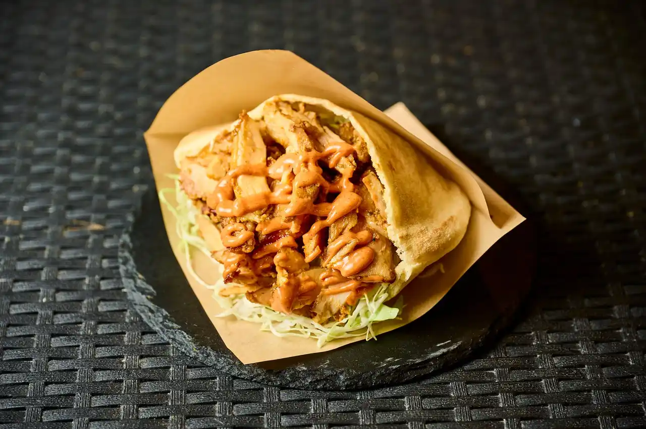 ピタパンやチャパティ(全粒粉と水を捏ねて生地を作り、発酵させずに薄い円形にのばして焼いたものである)とケバブチキン、キャベツ、ソースの一体感を味わえます。 |