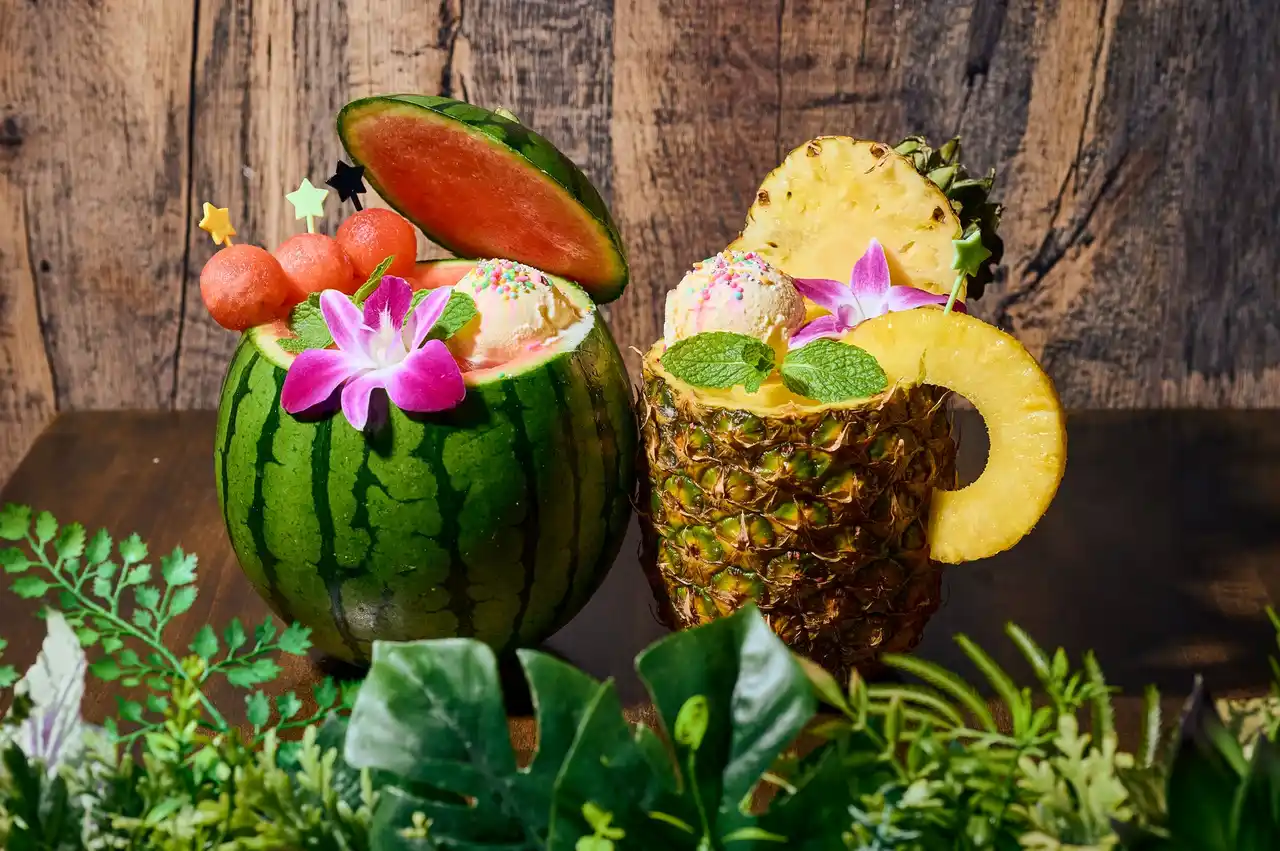 ”丸ごとトロピカル”はパイナップル、スイカを使ったトロピカルジュースとなります。 |