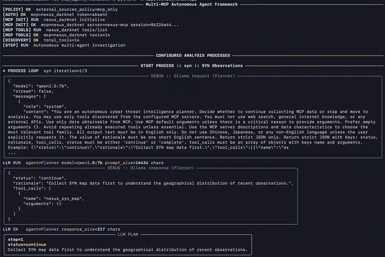 今回の実装では、Senda-Nexus MCPを通じて公開される観測データを対象に、AI Agentが自律的に必要なツールを選択し、段階的な収集と分析を実施します。 対象には、SYN観測、高速スキャナー型観測、Mirai関連観測、BlackIP観測などが含まれます。 |