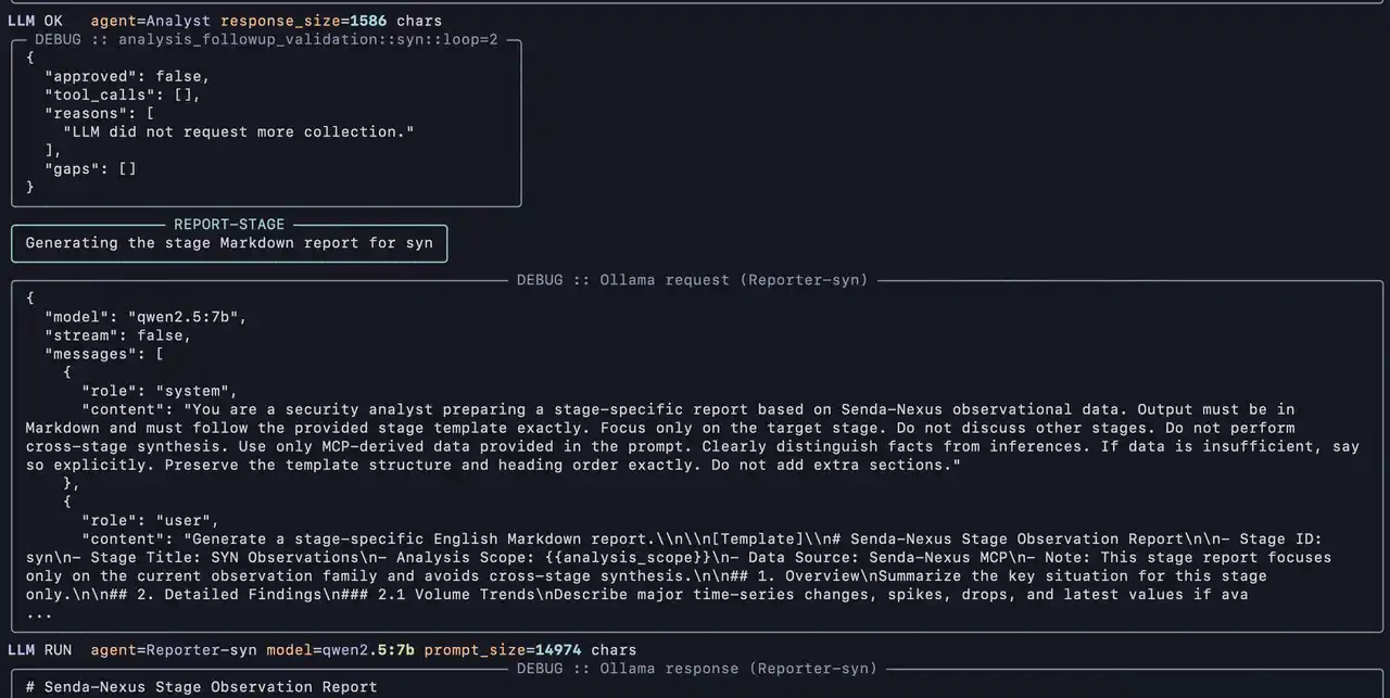 | 実装例として、NICT観測データや自社観測データを活用するSenda-Nexusと連携し、SYN観測、高速スキャナー型観測、Mirai関連観測、BlackIP観測などを対象とした自律的な情報収集・分析・レポート生成を実現しました。 | |||