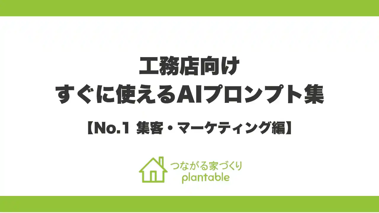 | 当社は、工務店向けコミュニケーションツール「つながる家づくり plantable(プランテーブル)」を通じた数多くの支援経験から、専門知識不要・最小限の情報入力だけで実務レベルのアウトプットが得られるプロンプト集を開発しました。 | |||||||||||||||