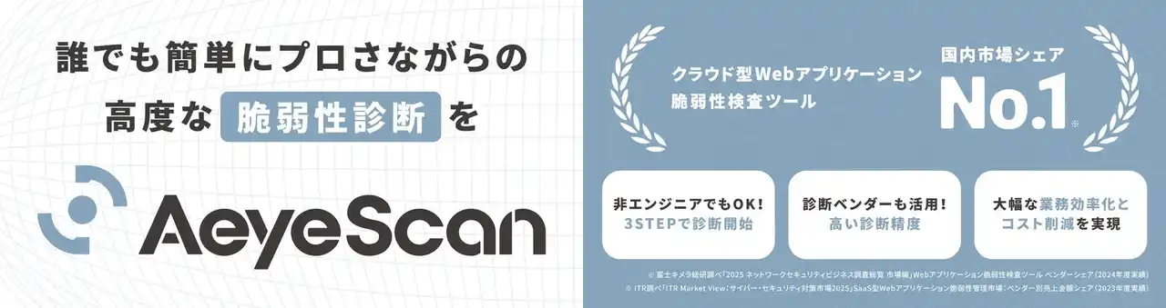 株式会社エーアイセキュリティラボ(https://www.aeyesec.jp/ 東京都千代田区、代表取締役社長:青木 歩)が提供するクラウド型Webアプリケーション脆弱性診断ツール「AeyeScan」が、「ITreview」のアワード「ITreview Grid Award 2026 Spring」において、「脆弱性診断ツール/サービス」部門で「Leader」に選出されたことをお知らせいたします。 |
