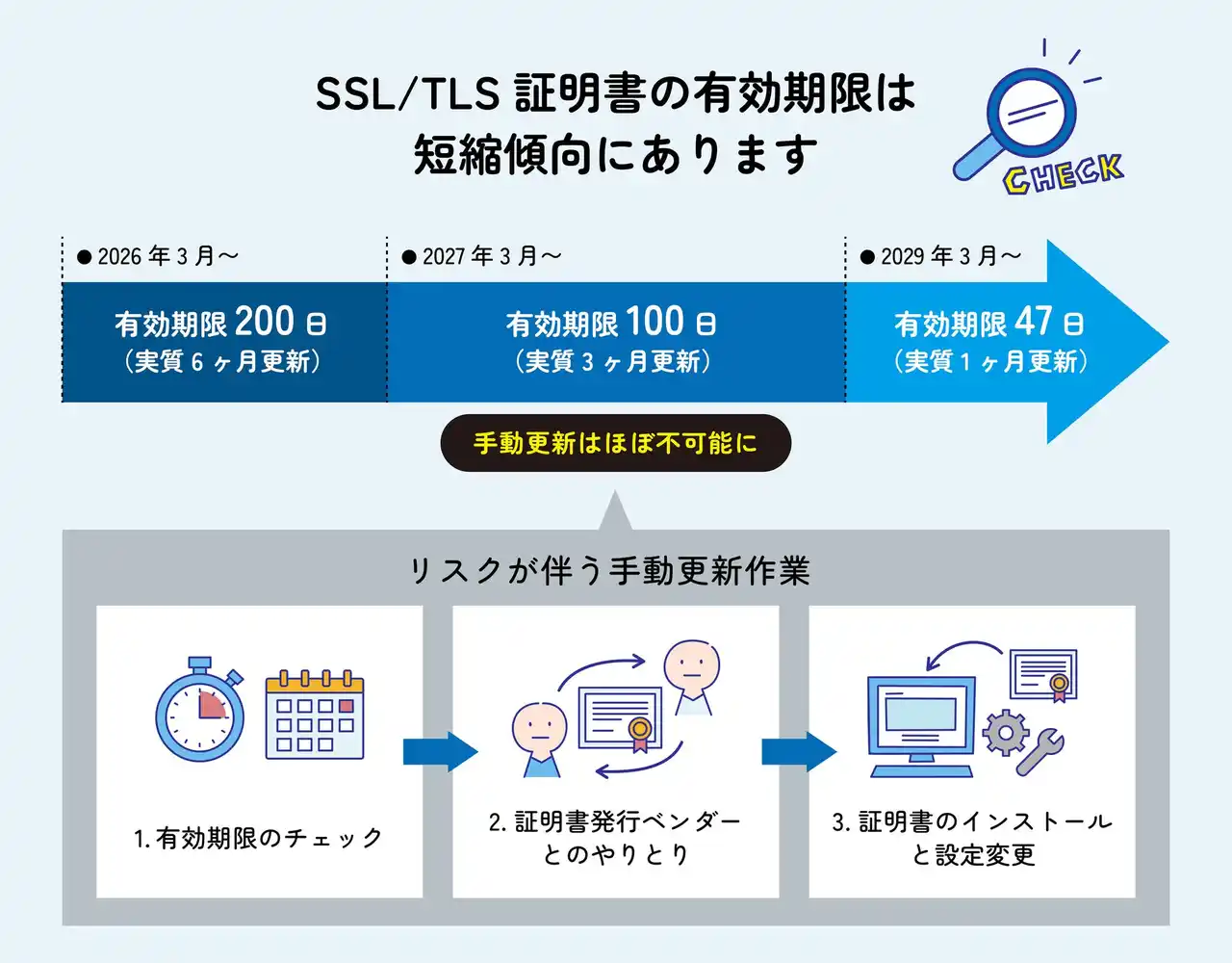 本サービスは、証明書の有効期限が2026年3月15日から200日へ、2027年3月には100日へ、2029年には47日へと段階的に短縮される状況に対応し、更新漏れによるサイト停止やセキュリティリスクの発生を防ぐことを目的としています。 |