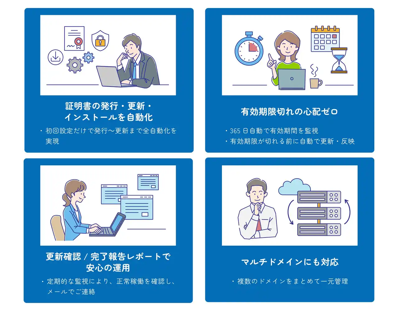 作業ゼロの自動更新 更新期限管理から更新作業まで当社が対応。自動更新のため、お客様での日常的な運用作業は不要です。 |